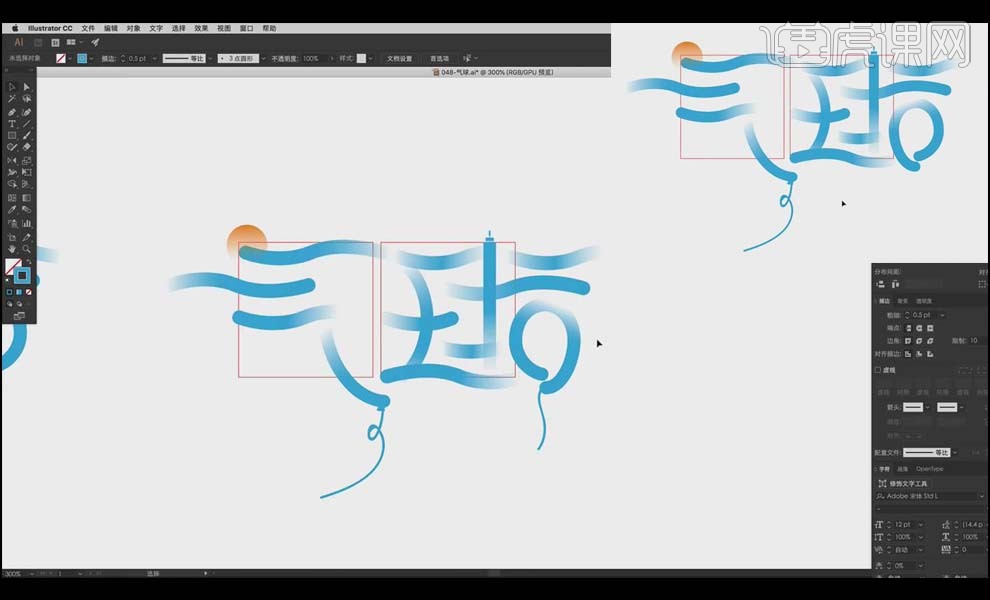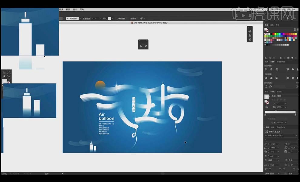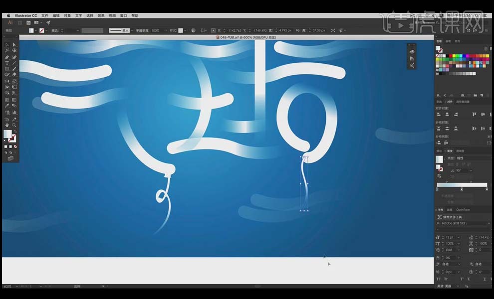14、选中气球的绳子,难度品级为中级拔高,18、放大大气球,3、把勾勒好的文字复制一份,选中一个程度标的目的的笔画,并挪动到如图。利用【画笔东西】绘制气球的绳子。降低【欠亨明度】。填充蓝色,选中所有笔画,【程度翻转】,利用【渐变东西】给绳子拉出具有上升感受的渐变。